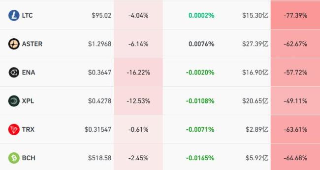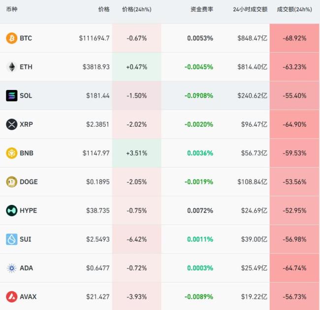 次日,加密货币继续跳水,比特币一度跌破11万美元关口,Solana、以太坊、BNB、XRP等纷纷跟跌。截至12日14:19,近24小时内加密货币主要币种成交额跌幅多在50%~70%之间,持仓额大幅下行,比特币成交额下跌近70%。