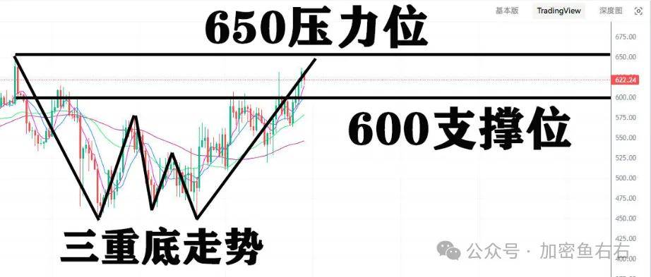 BCH从日线级别来看,整体震荡上行,有望形成完整的三重底走势,再加上其日线和周线的MACD已经形成零上金叉,说明后续行情还有上涨空间,将去冲击前高650压力位,短期若能回调至600附近,可抄底炒个波段,拿到650附近再止盈出局。