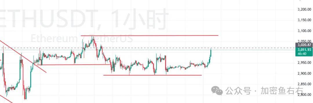 ETH短期震荡结束后开始反抽,这波反抽力度还挺强势,不过整体依然处于震荡区间,4h级别价格触及MA120均线压力位置,小级别已经加速上涨,这种急速上涨很容易收针,一旦收针大概率要开始震荡下跌了,