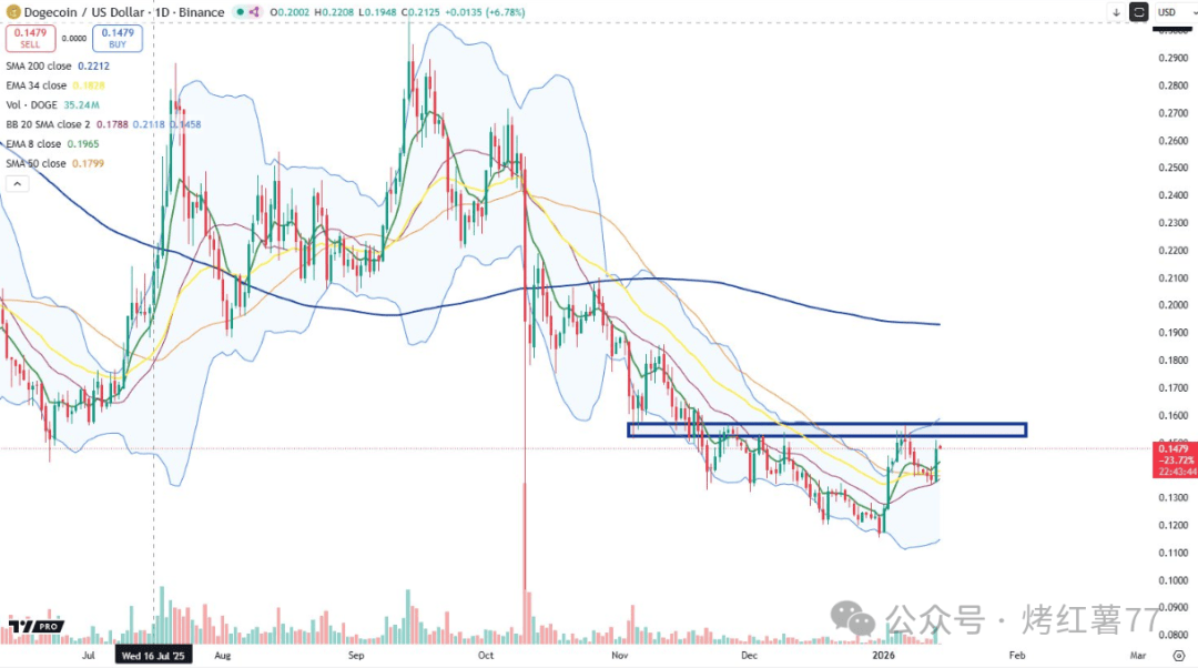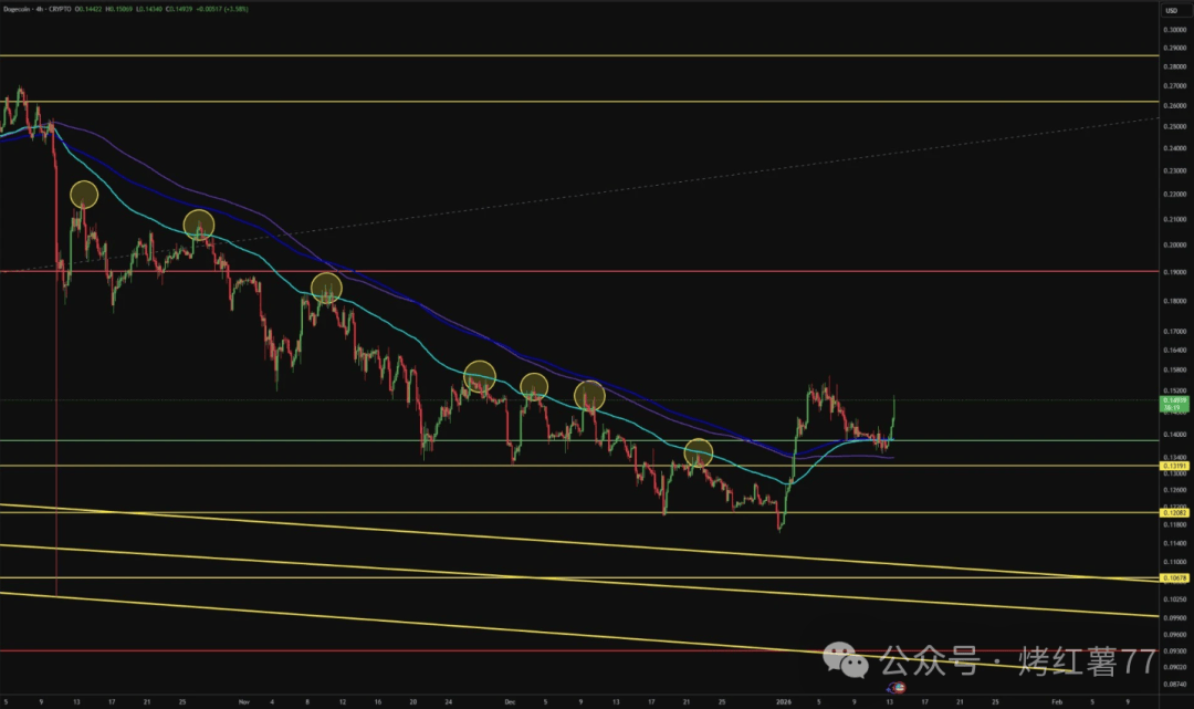 回顾历史走势,狗狗币在下跌趋势中多次受制于下移的均线压力。但本轮反弹有所不同,价格不仅收复关键均线,更在回调中成功守稳,未出现以往的大幅回落。