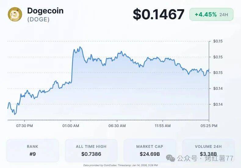 近日狗狗币日线走出强势K线组合,最新一根阳线一举吞没前五根阴线,显示买盘动力显著增强。盘中最高触及0.1508美元,收盘站稳0.1467美元,直逼上方阻力区。