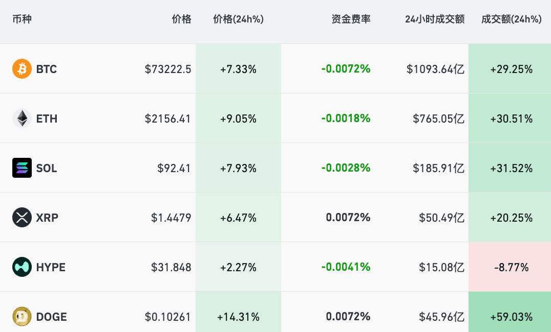 加密货币概念股集体大涨,Coinbase涨超14%,Strategy涨超10%,Figure涨超7%,Circle涨超5%。加密货币主要币种同步猛涨,截至北京时间6:30左右,比特币、SOL涨超7%,以太坊涨逾9%,狗狗币大涨超14%,最近24小时全球共有超12万人被爆仓。