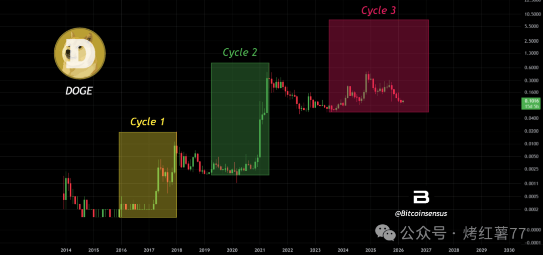 第三周期(现在):经历长时间回调后,目前价格在0.10美元附近徘徊。Bitcoinsensus认为,现在的走势很像前两次大行情启动前的盘整期——横得越久,爆得越猛。