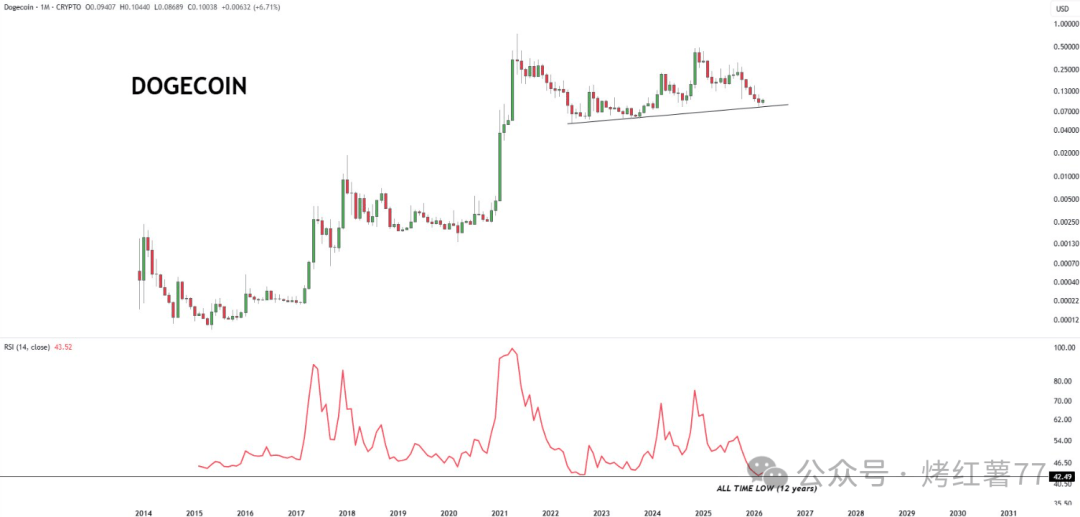 更狠的是,RSI指标(相对强弱指数)正在接近12年来的历史低点!这意味着什么?在宏观时间框架下,狗狗币已经严重超卖。历史经验表明,这么低的RSI读数,通常出现在大资金悄悄吸筹的阶段。