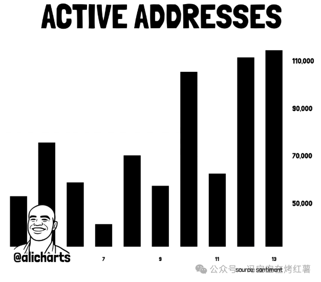马丁内斯提到,过去一周,狗狗币的活跃地址从41,557个猛增到114,662个,涨幅高达176%。这个指标反映的是每天真正在用狗狗币转账、交易的人数。突然跳涨,说明关注度和使用量都在回来。