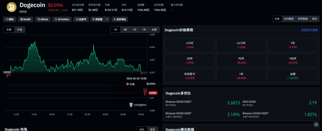 从近期表现看,DOGE表现确实偏弱:7天跌了5.97%,30天跌了3.39%,年初至今跌了22.95%,180天更是跌了65%。市值目前139.21亿美元,现货成交额仅2.38亿美元,合约成交额21.70亿美元,持仓量10.15亿美元,说明杠杆资金参与度还行,但现货跟风明显不足。