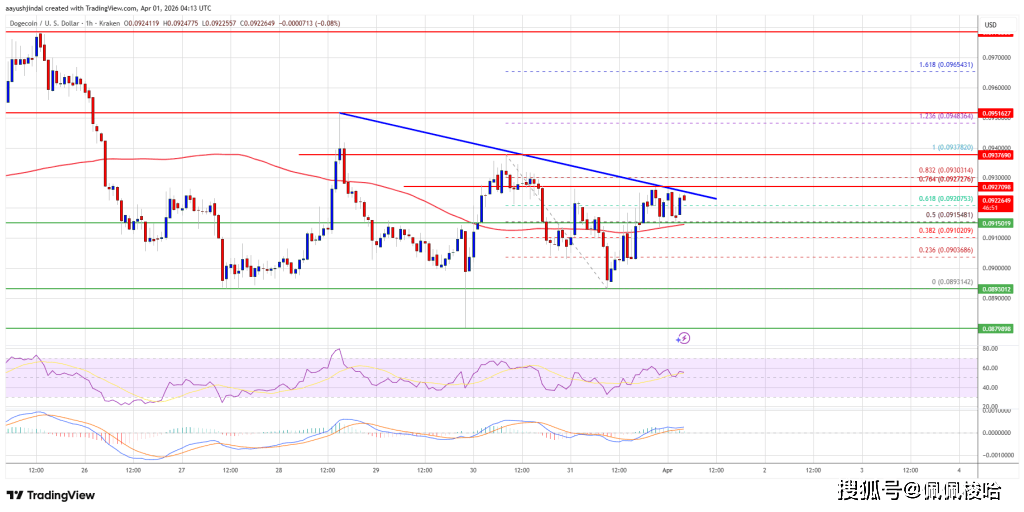 狗狗币价格目前交易于 0.0912 美元上方,并高于 100 小时简单移动平均线。如果出现新一轮反弹,上方的直接阻力位在 0.09280 美元附近,该位置也是趋势线 美元低点下跌行情的 76.4% 斐波那契回撤位。
