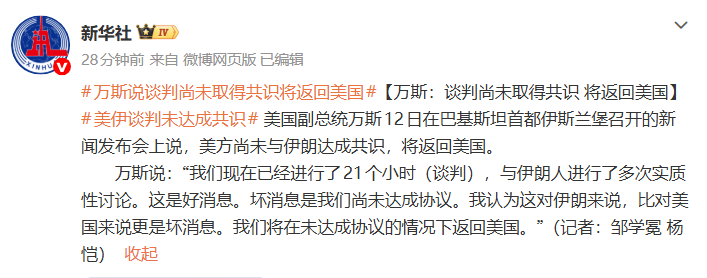 美国副总统万斯12日在巴基斯坦首都堡召开的新闻发布会上说,美方尚未与伊朗达成共识,将返回美国。
