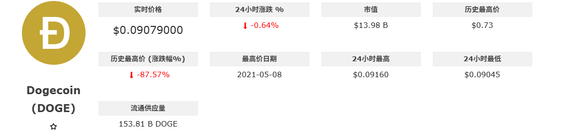 跟历史最高0.73美元比,现在跌了87.57%。那还是2021年5月8日的事,现在回想跟做梦一样。流通量153.81亿枚,盘子大,所以动不动就被情绪带着跑。