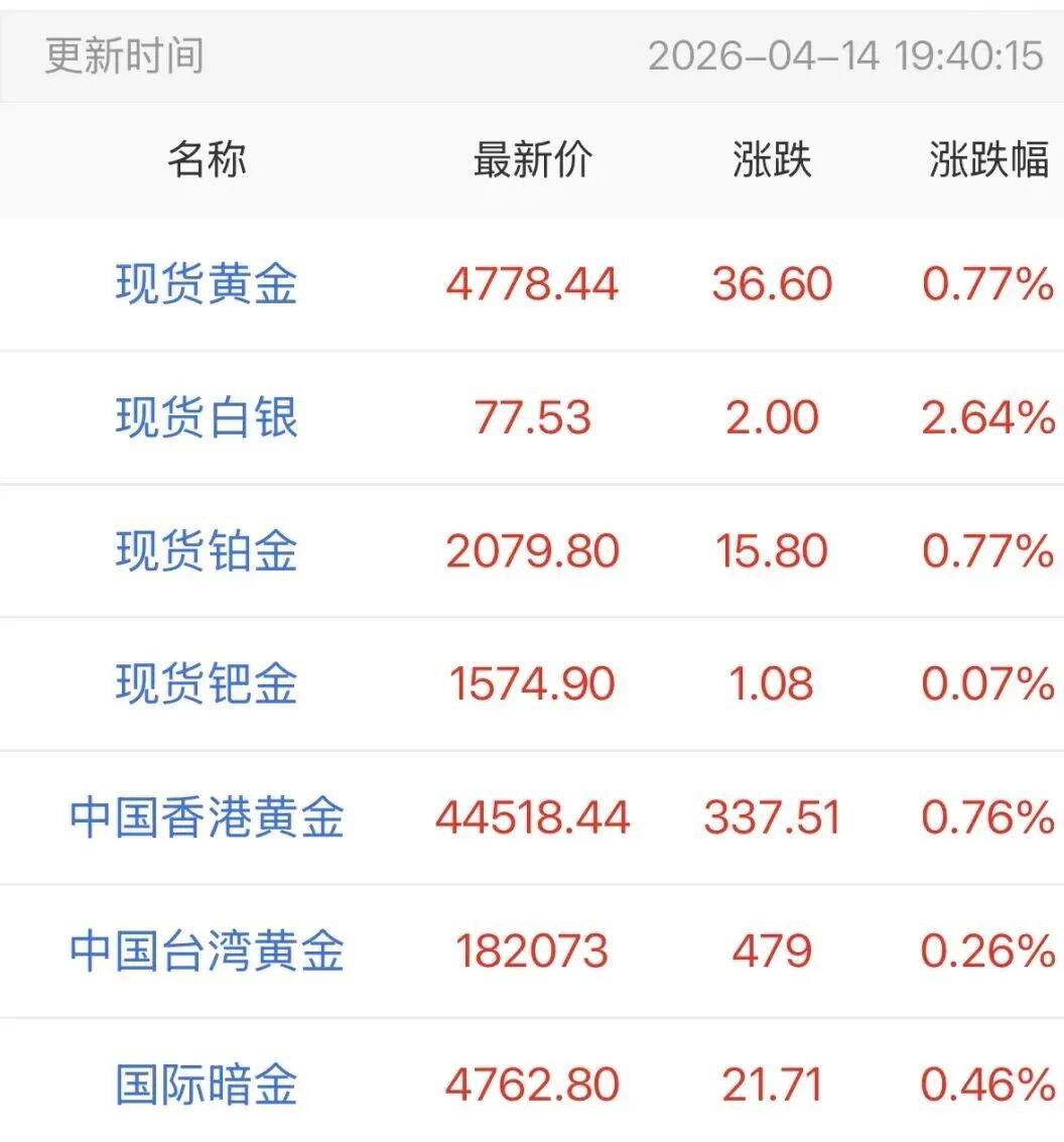 黄金、白银价格直线美元/盎司;现货白银大涨2.64%,报77.53美元/盎司。