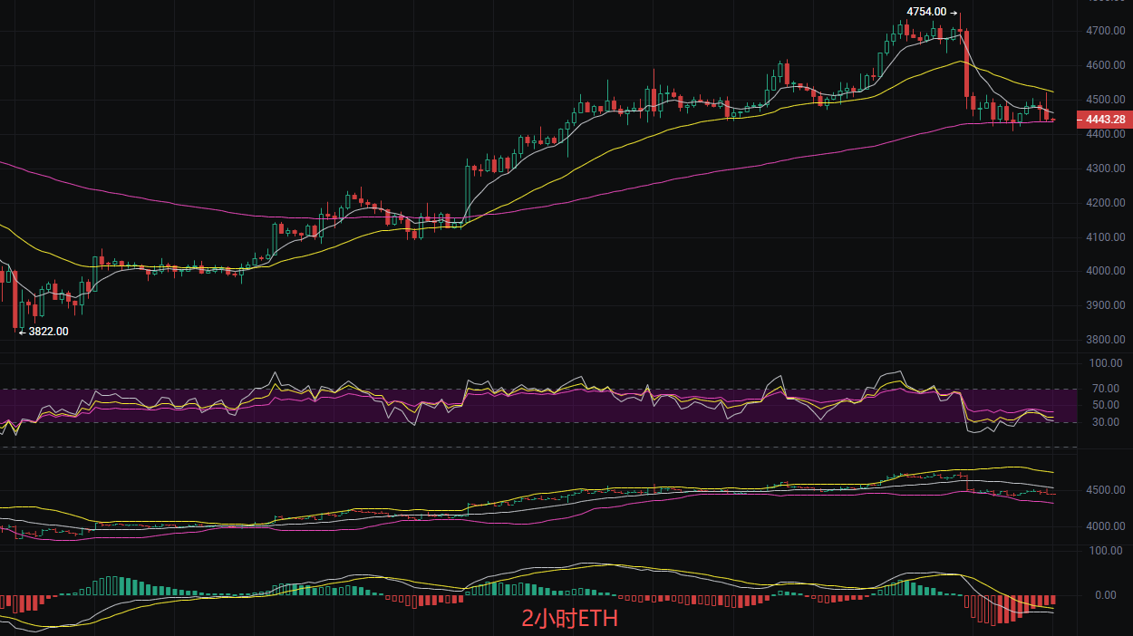 发稿前以太坊现价4445,丽盈观察目前盘口以太明显的下跌趋势,黄昏之星形态的出现,以及短期均线向下的趋势,与价格跌破短期均线形成了强烈的看跌共振。这表明市场可能进一步下探,尤其是在关键支撑位4000附近,若失守则可能打开更大的下行空间,日线区域形成明显的短期压力,多次上攻未果后逐步走低,MACD2小时空头动能占优,但有缩减迹象,EMA趋势偏空,思路上丽盈建议高位做空为主,多为辅