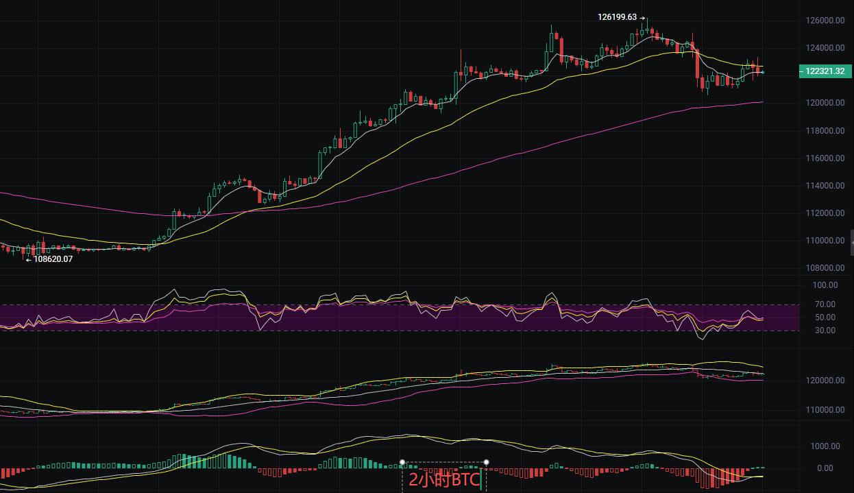 比特币现价122400,丽盈判断大饼典型的区间震荡格局,技术面和外部环境均未提供明确的趋势指引。黄昏之星形态的出现以及成交量的极度萎缩,表明市场缺乏足够的买盘支持,短期内上行动能不足,需警惕震荡偏弱的可能性。日线形成明显的下跌趋势反弹力度较弱,2小时K线附近多次测试支撑位,整体偏弱势整理,MACD2小时短期进入震荡,EMA短期趋势偏空长期趋势依然看涨,丽盈建议在下一波探底以后可以考虑空单止盈,考虑开多