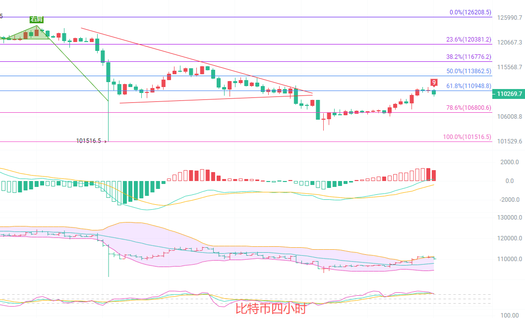 四小时K线出现双顶十字星的看空指标,短期内行情技术性回落是必然,再没有利好消息刺激的情况下,行情空势会延续,MACD放量也开始减少,DIF和DEA两极分化明显,K线回到了通道内,现在上轨重新对主力形成压制,关注布林带中规支撑108000,若无法有效突破中规则南下止盈离场,考虑短线北上