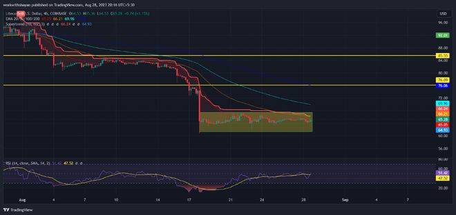 不断下降的移动平均线和在中线附近挣扎的 RSI 表明空头仍在主导市场。卖家的目标是将价格拉向整合模式的下端,如果成功,我们可能会看到 LTC 价格测试 60 美元的支撑位。