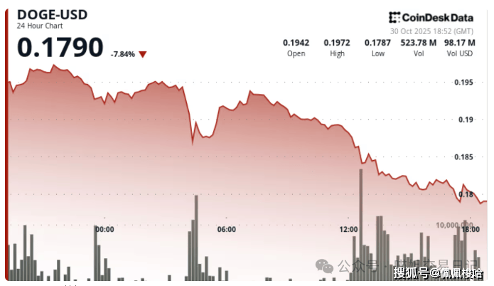 狗狗币(DOGE)在24小时内从0.1934美元大幅下跌至0.1803美元,跌幅达8.9%,跌破多个支撑位。与此同时,狗狗币的交易量较七日平均水平飙升44%,创下本月单日交易量增幅最大的纪录之一。