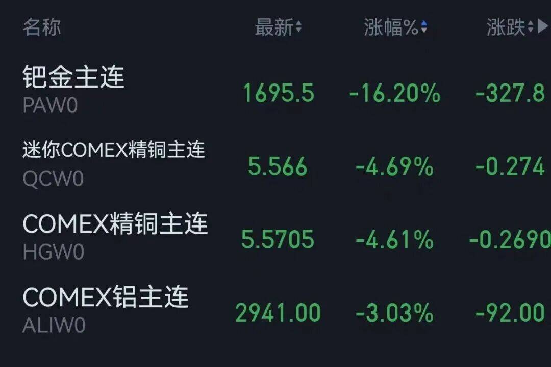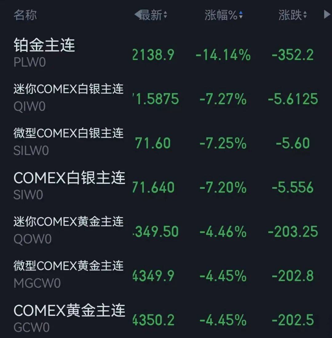 截至收盘,COMEX黄金期货价格跌4.45%,报4350.2美元/盎司;COMEX白银期货价格跌7.2%,报71.64美元/盎司。现货白银价格大跌近9%,现货钯价格跌超15%,现货铂价格跌超14%。