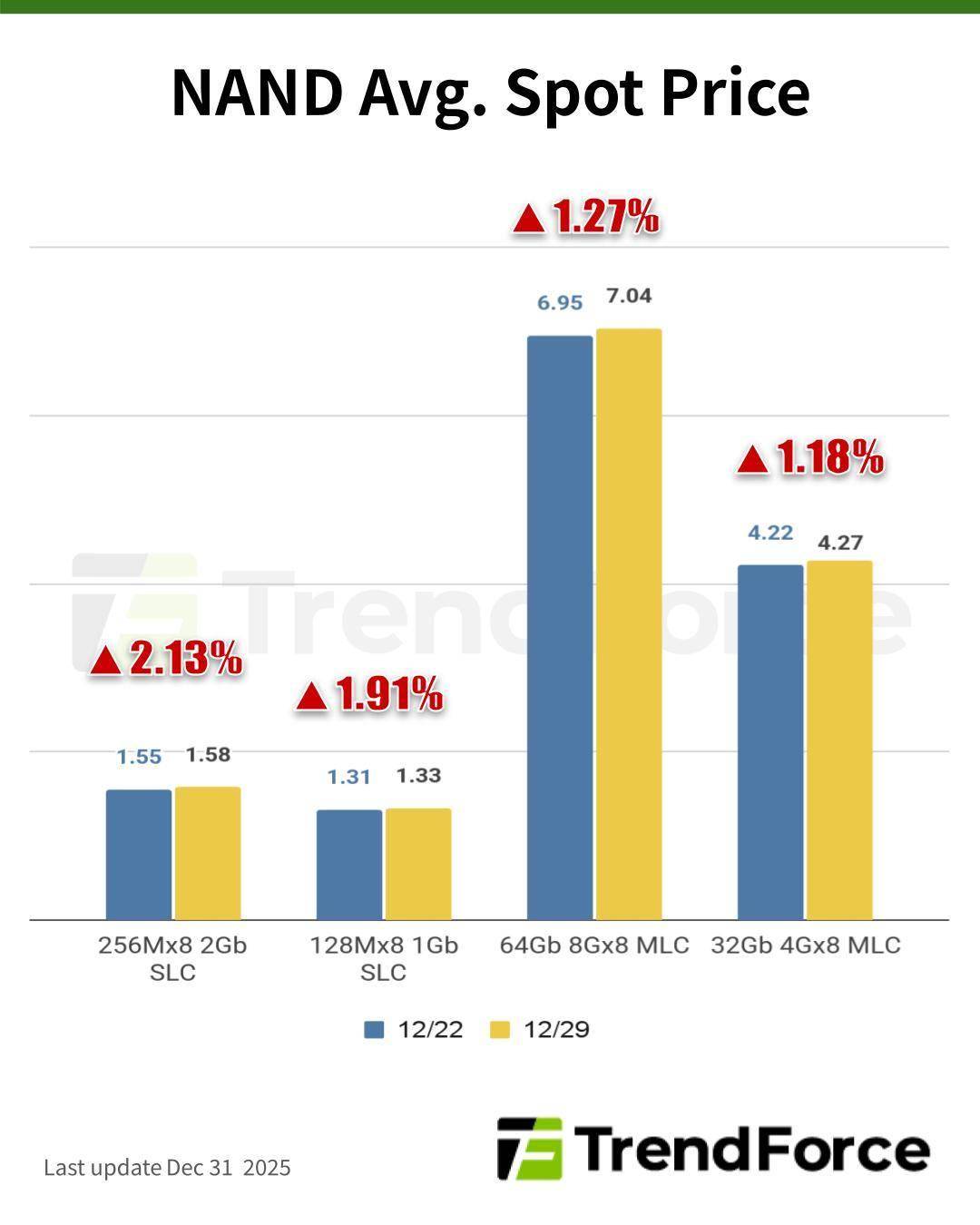 NAND Flash 市场同样处于上涨通道。受 2026 年第一季度合约价格看涨的强烈预期驱动,现货价格进一步走高。本周,512Gb TLC 晶圆的现货价格大涨 13.35%,达到 13.055 美元。现货贸易商对后续价格走势持极度乐观态度,因此在出货价格上寸步不让,坚决维持高价策略。