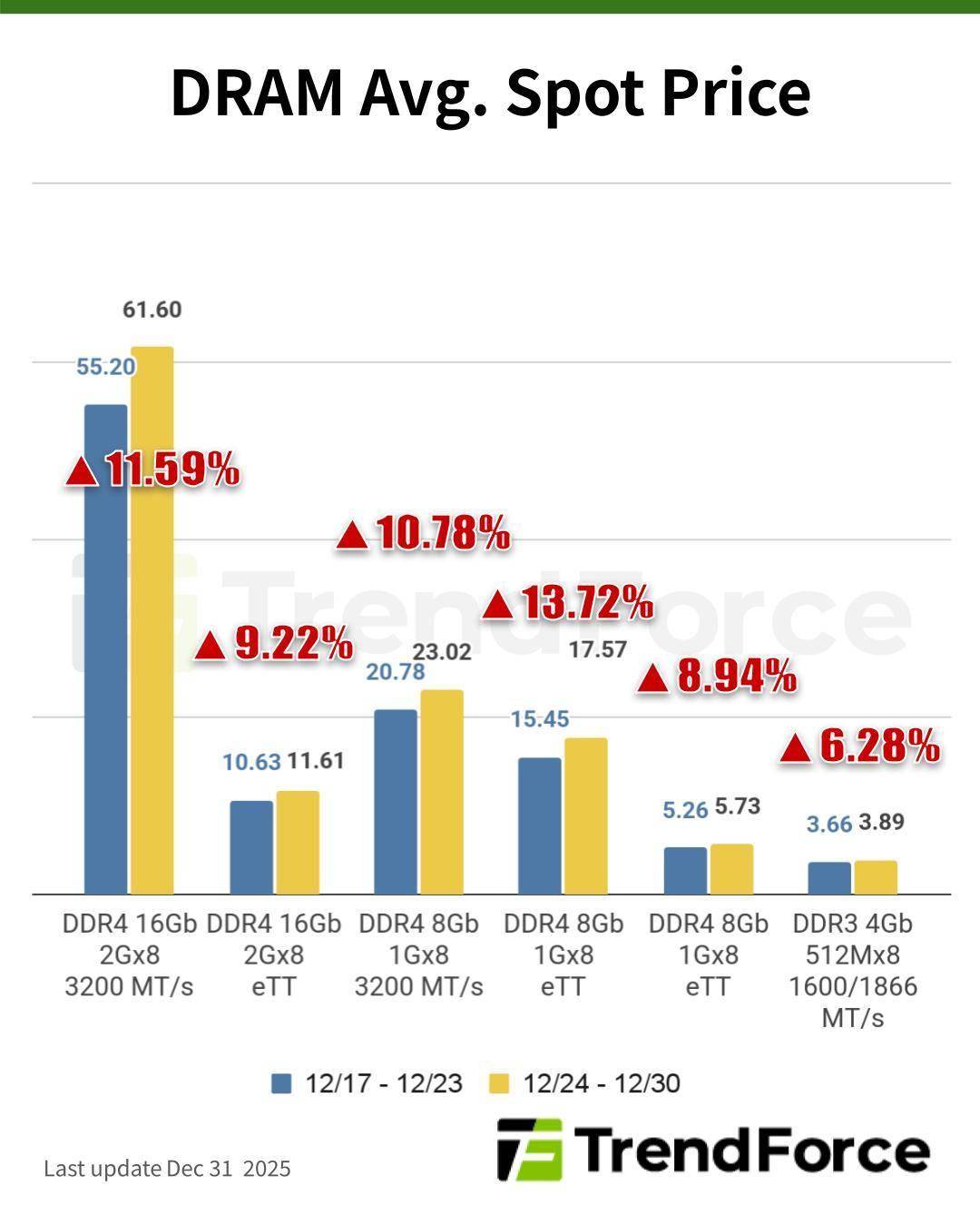 该机构指出行业巨头三星已明确表态:绝不推迟其 DDR4 产品的停产(EOL)计划。这一强硬立场直接打破了市场对供应延续的幻想,DDR4 的价格涨幅因此大幅超越了新一代的 DDR5。