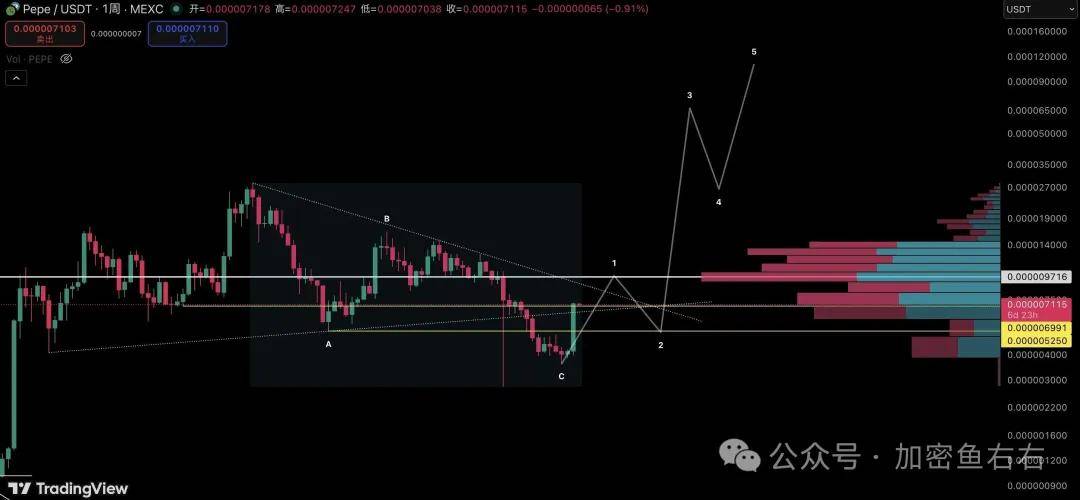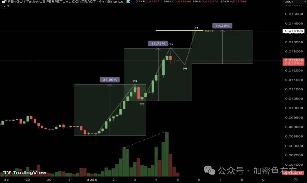 MEME行情,PEPE带头,PENGU有希望后面跟随,结构显示出清晰的三浪形态,第四浪目前处于修正阶段。第三浪已得到成交量的确认,目前PENGU成交量大,涨的不多,拉盘比较猛,看好后续行情。
