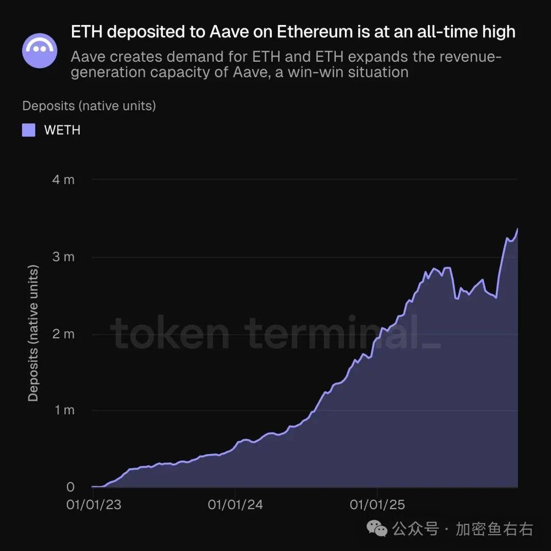 AAVE在以太坊主网上的ETH存款数量已创下历史新高,突破300万枚,并正向400万枚的目标稳步迈进。AAVE创造了对ETH的大量原生需求,而ETH的存入则增强了AAVE的收入生成能力,形成双赢局面。$AAVE 现在是不是极具性价比?
