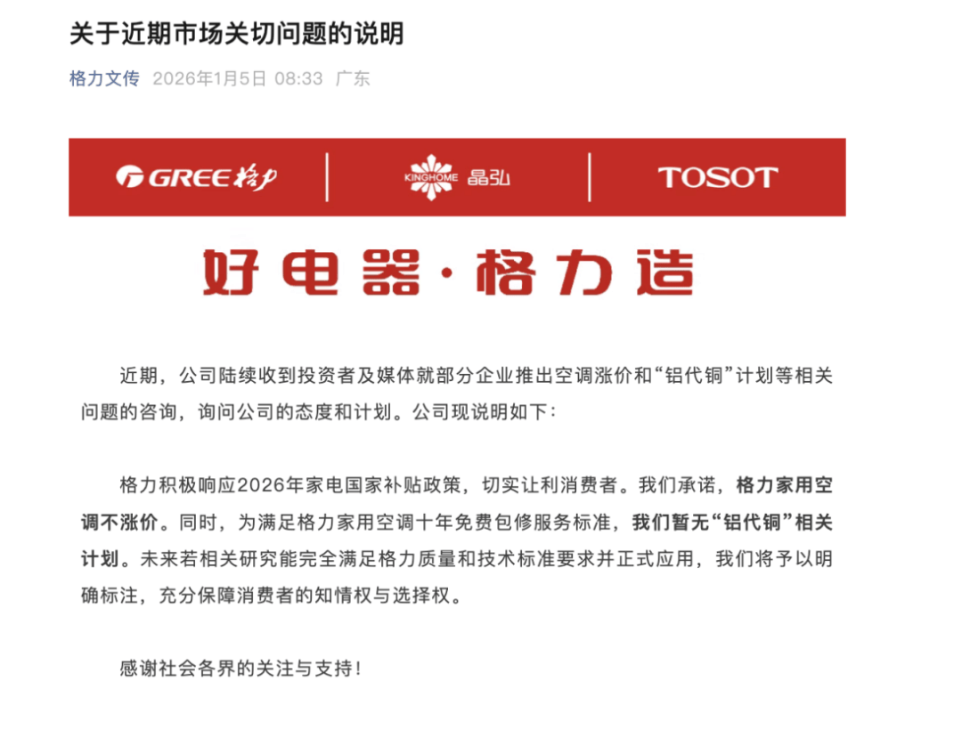 ● 2026年1月5日上午,格力电器发布声明回应市场关切问题时表示,家用空调不涨价,且暂无“铝代铜”相关计划。