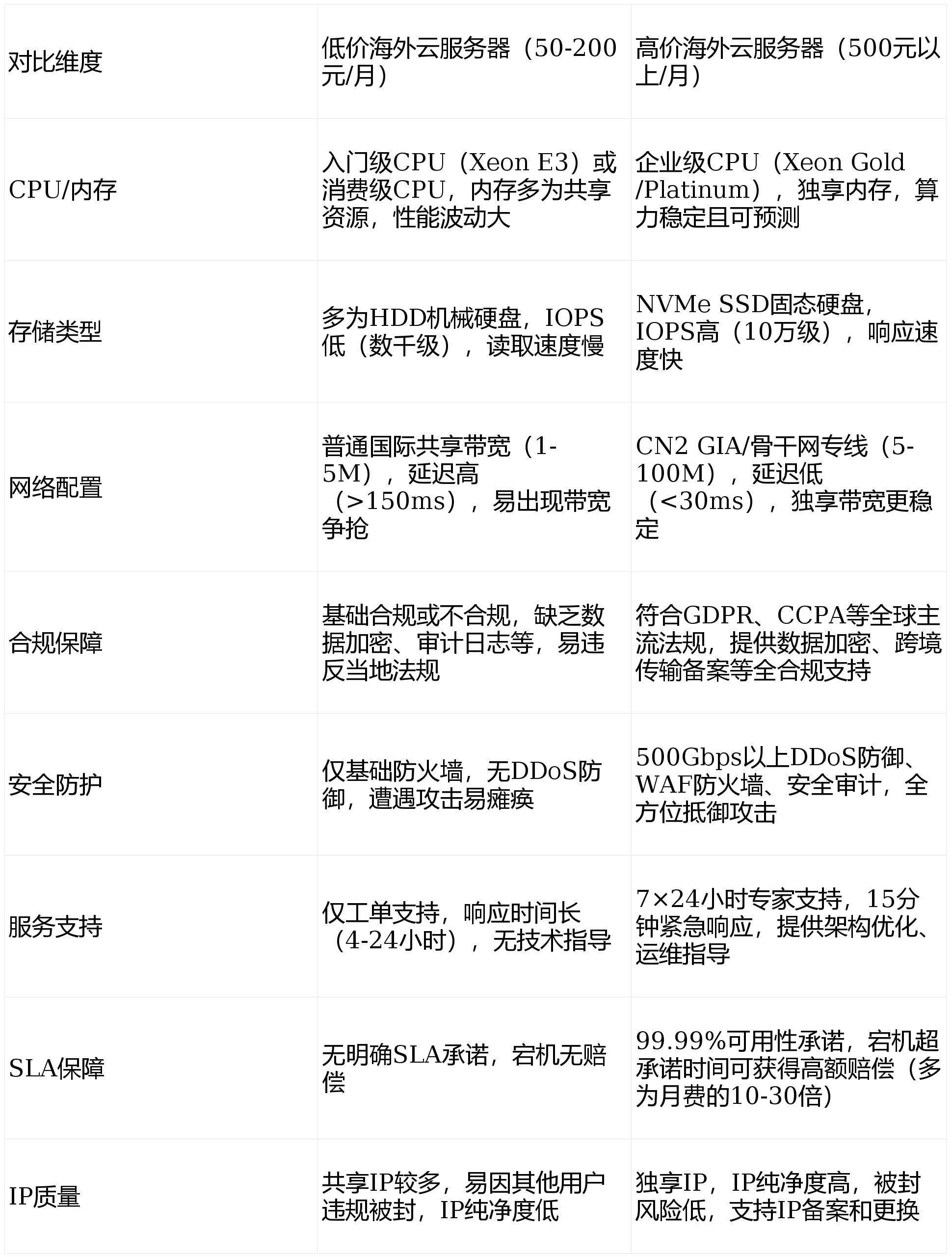 为了让你更直观地判断,我们从用户最关心的8个维度,对低价(月费50-200元)和高价(月费500元以上)海外云服务器进行全面对比: