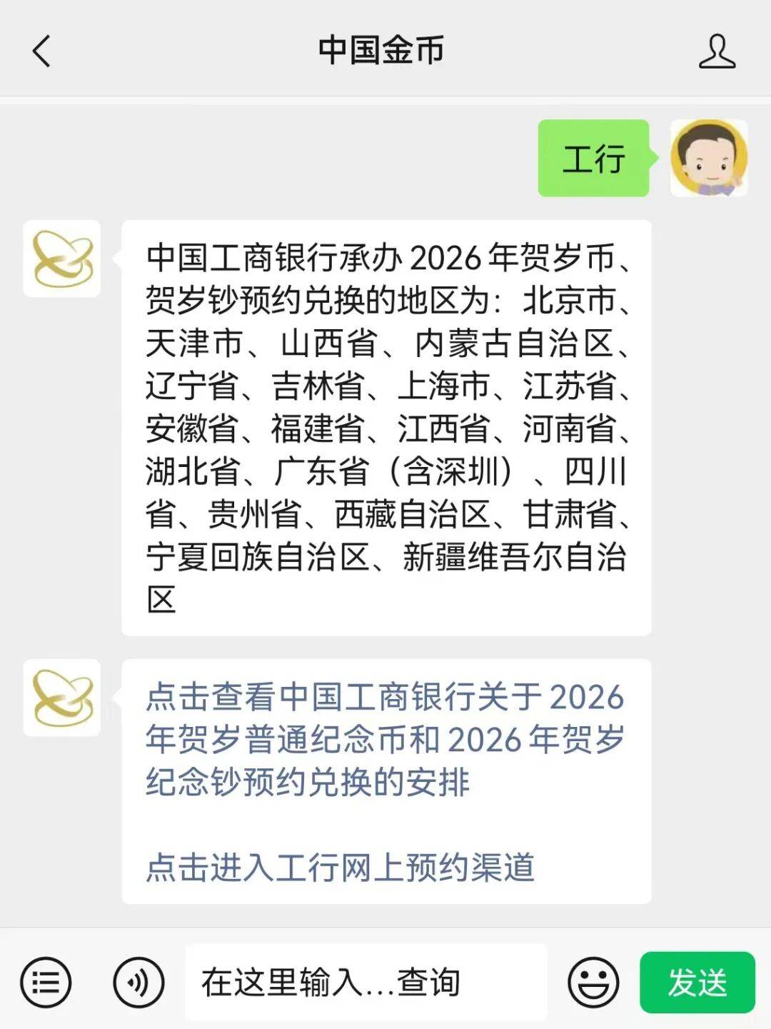 徽商银行、长沙银行、陕西农信等承办机构的预约兑换信息,大家可以在“中国金币”微信公众号下方消息栏中回复关键词查看;或者关注以上银行微信公众号,底部菜单均有预约渠道。