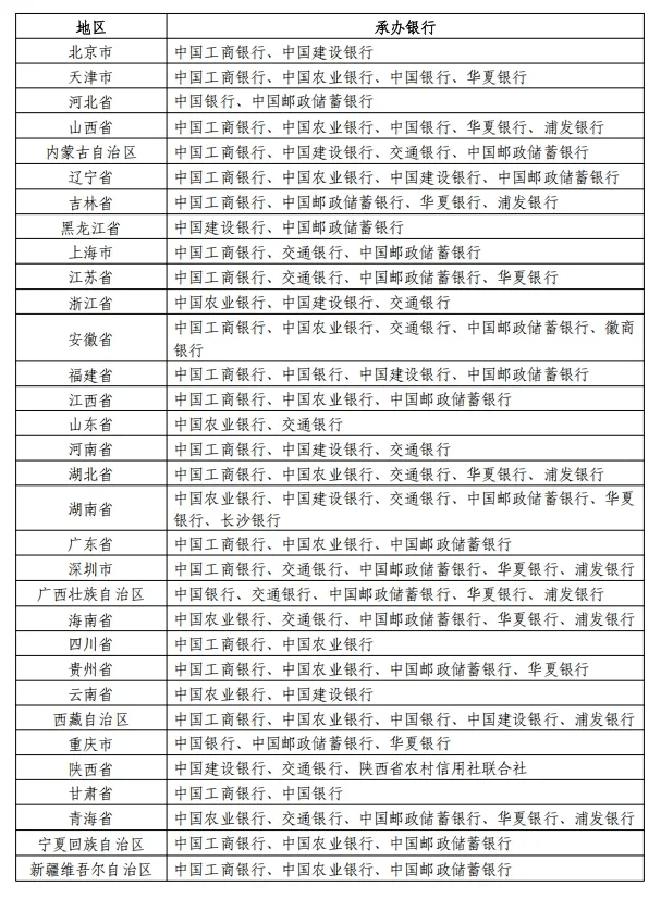 预约承办银行:中国工商银行、中国农业银行、中国银行、中国建设银行、交通银行、中国邮政储蓄银行、华夏银行、浦发银行、徽商银行、长沙银行、陕西省农村信用社联合社