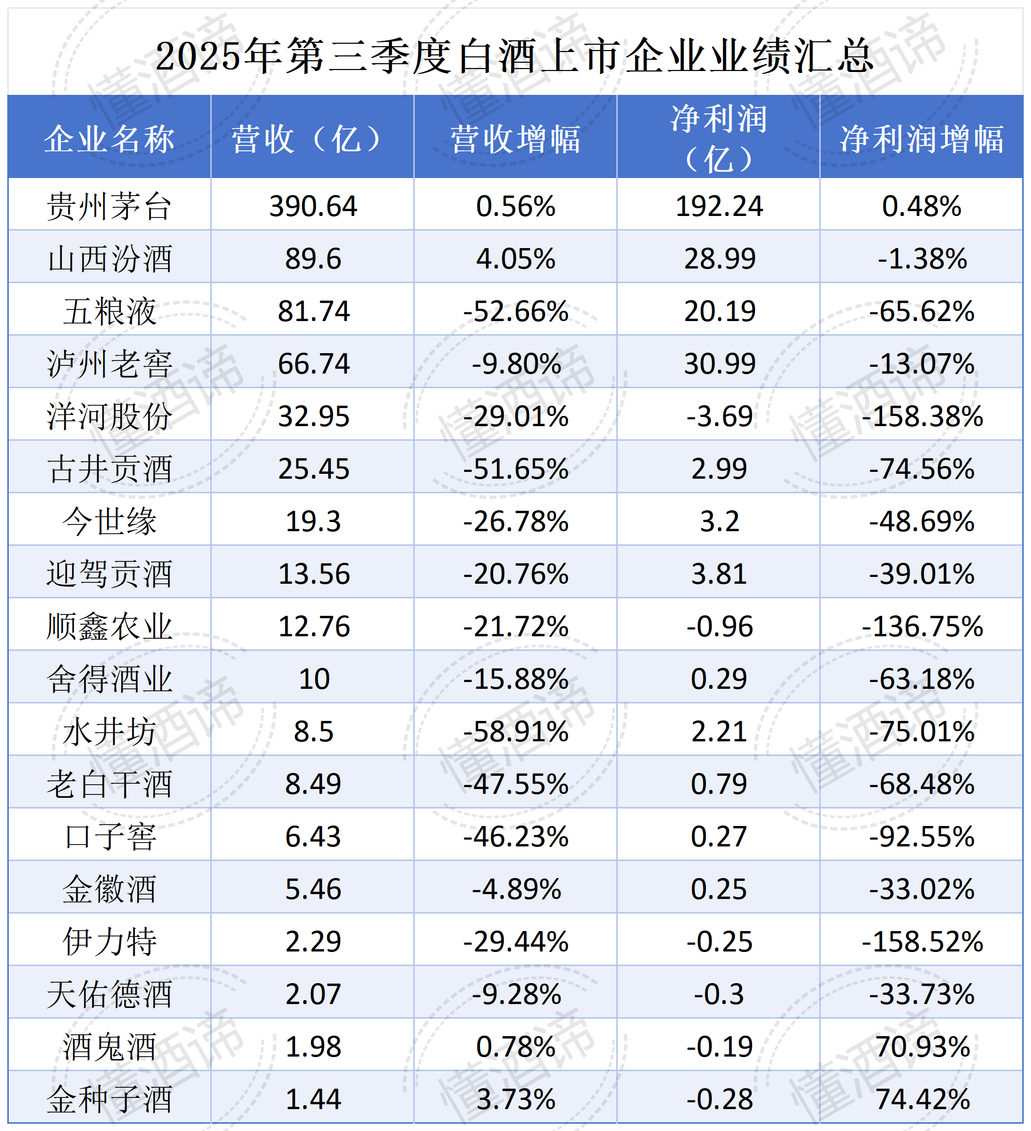当经销商手里捏着那份名单,睁大了眼睛,盯着2025年白酒上市公司三季度业绩汇总表中,一串串绿到不能再绿、动辄腰斩的营收数据和净利润数据时,难免会发出感叹——白酒行业的天,真的要变了。