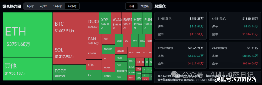 过去24小时全网共有 90,200人被爆仓,爆仓总金额为$1.71亿美元,多单爆仓8805.34万美元,空单爆仓8246.08万美元。