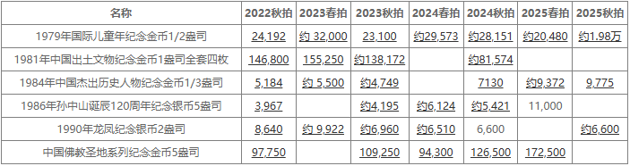 其它主题纪念币,较2024年相比,整体平稳,个别品种呈微调趋势。1979年国际儿童年1/2盎司纪念金币,2024春拍价格为29753元,2024秋拍以28151元成交,2025春拍成交价20480元,2025秋拍成交价约1.98万,有所回调。1984年中国杰出历史人物纪念金币1/3盎司,2024秋拍以7130元的价格成交,2025春拍价格为9372元,价格上涨,2025秋拍价格为9775元。1990年龙凤纪念银币2盎司,2024春拍价格为6510元,2024秋拍到6600元,2025秋拍维持在6600元左右,经典品种较为稳定。