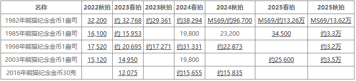 熊猫金币是现代币最受欢迎的品种之一,价格相对稳定。1982年金猫是中国首套投资金币,在熊猫系列中深受藏家喜爱,与2024年秋拍相比,因2025年金价的上涨,价格大幅提升,2023春拍成交价为32768元,2024春拍成交价为38294元,2024秋拍MS69分数,成交价为96700元,2025春拍中成交价格为13.26万元,2025年秋拍,受金价上扬的作用下,价格提升。1985年熊猫纪念金币1盎司,2023春拍成交价20695元,2024春拍以31331元的价格成交,2024秋拍成交价22873元,2025春拍价格为35000元,2026年秋拍成交价约为3.3万,基本持平。2003年熊猫纪念金币1盎司,在2025秋拍和2025春拍相比,价格上涨。