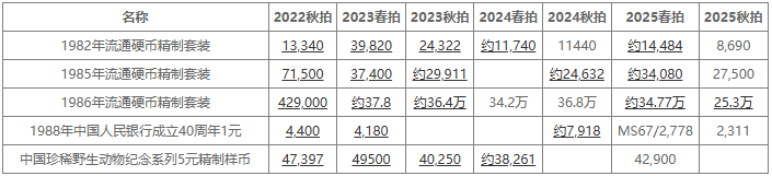 流通币部分,1982年流通币精制套装,有所回落,2023秋拍成交价格为24322元,2024春拍价格仅为11740元,2024秋拍成交价为11440元,2025春拍成交价格最高为14484元,而在2025秋拍价格仅为8690元;1985年流通币精制套装,价格自2024秋拍回落至24632元后,2025春拍成交价格为34080元,2025秋拍价格降到27500元。同样1986年流通币精制套装同样呈回调态势。流通纪念币部分,受品种、上拍量及存量的影响,价格也有浮动,以1988年中国人民银行成立40周年1元为例,2023春拍价格为4180元,至2025春拍2778元成交,价格下降,2025秋拍价格再降至2311元。