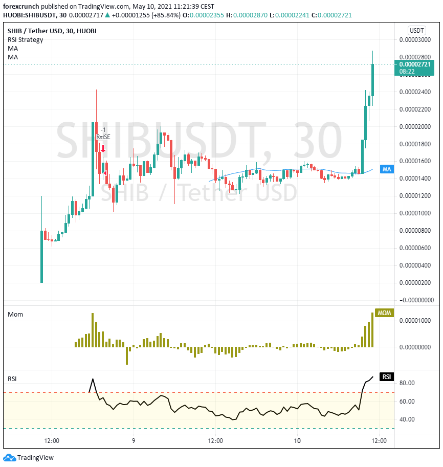 这位特斯拉和太空探索技术公司(SpaceX)首席执行官埃隆·马斯克在《周六夜现场》节目中提到狗狗币后,SHIB的价格一路飙升。