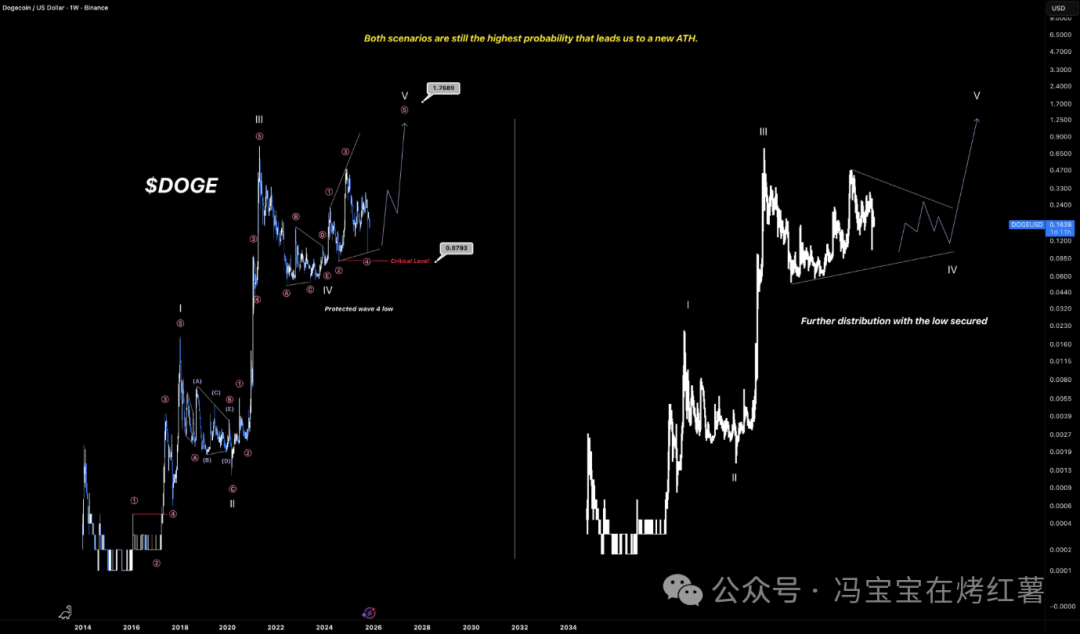特别强调,“周期目标仍维持在1美元以上”,该预期基于第五浪的几何结构与狗狗币在2017年、2021年等早期牛市中的扩张形态相似。目前价格仍远低于该目标区,且未跌破第四浪关键水平,整体看涨形态依然成立。