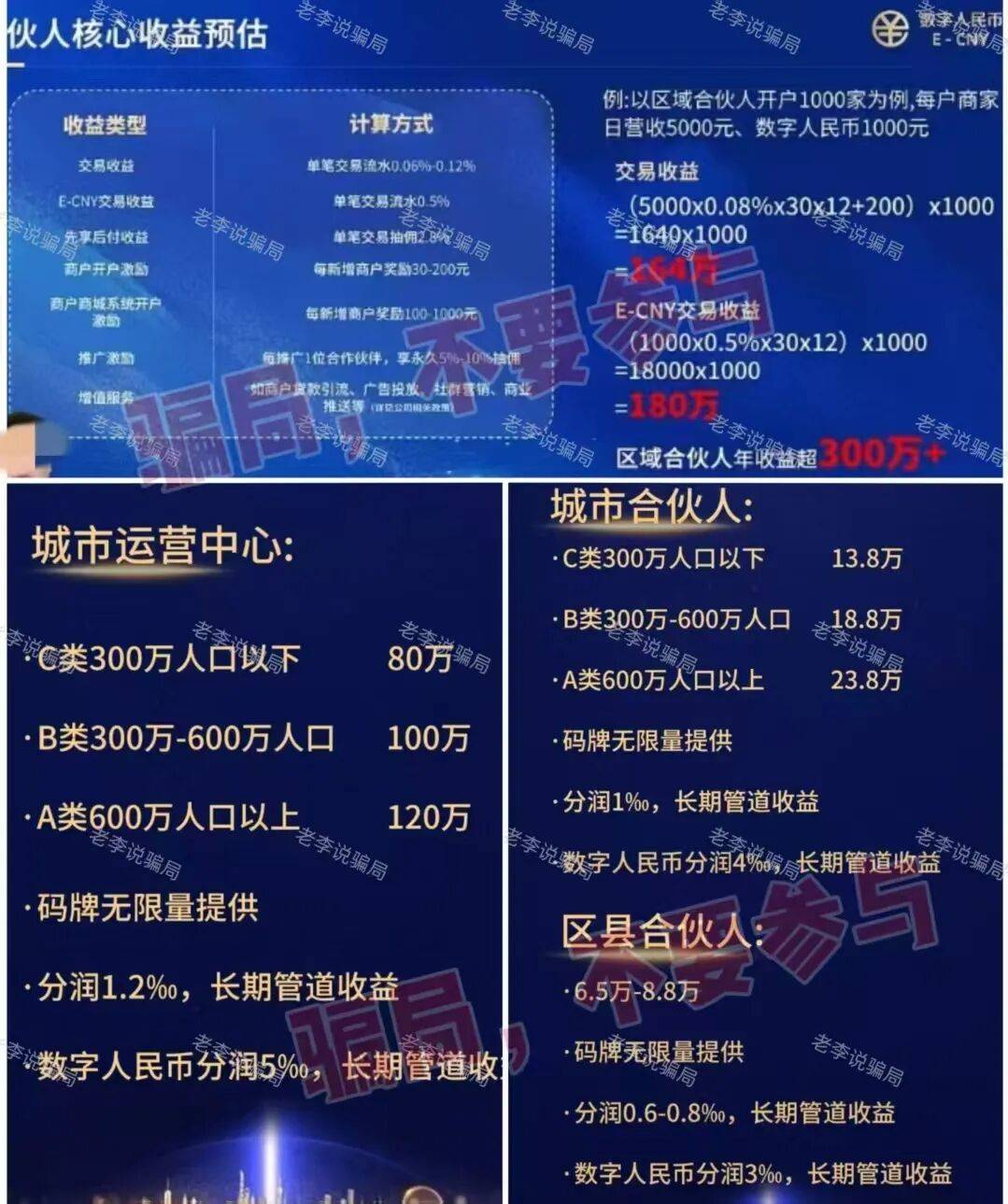假借“数字人民币”推广名义,招募所谓的“合伙人”,利用高额回报收取加盟费。