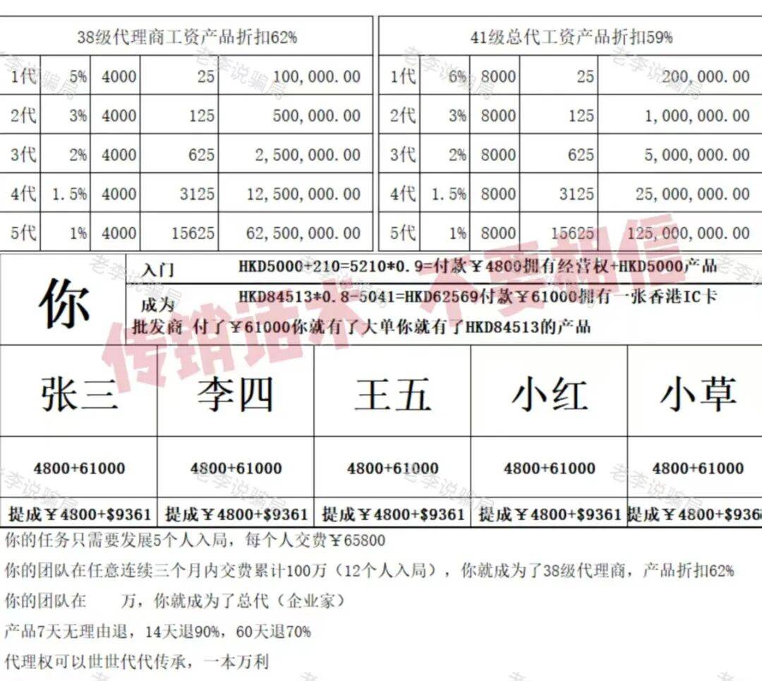 该传销组织通常打着“连锁经营”“资本运作”“国家项目”等旗号,声称缴纳11份36800元或21份69800元加入其中,采用五级三晋制发展下线万元回报。