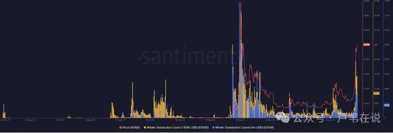 在过去的一个月中,狗狗币的鲸鱼活动大幅增加,超过 100 万美元和 10万美元的交易数量不断增加就是明证。