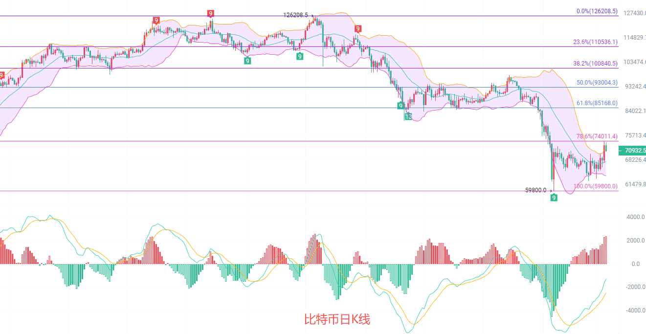 目前日K线一线回落到了七万附近,日K线,EMA趋势指标依旧是北上的趋势,EMA60阻力位在76000,支撑点在EMA30一线,说明短线支撑已经抵达可以考虑北上,MACD放量上行,DIF和DEA向上扩散靠近了0轴线,K线回落到了通道内,中轨关注67750,若行情跌破中轨则北上失败