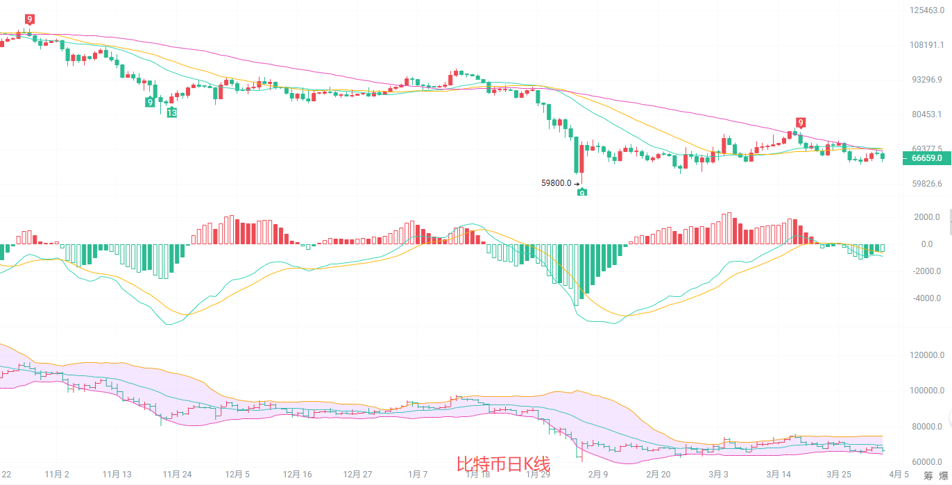 日K线均线系统呈现典型的南下排列,MA20、MA30、MA60全部向下,价格在均线下方运行,反弹受到强压。MACD指标DIF与DEA在零轴下方死叉,绿柱持续放量,南下动能未减。布林带开口向下,价格运行在下轨附近,下方强支撑为59800的历史低点,上方压力位为74011的斐波那契强压,日线级别整体处于弱势下行格局,短期难有大级别反弹。