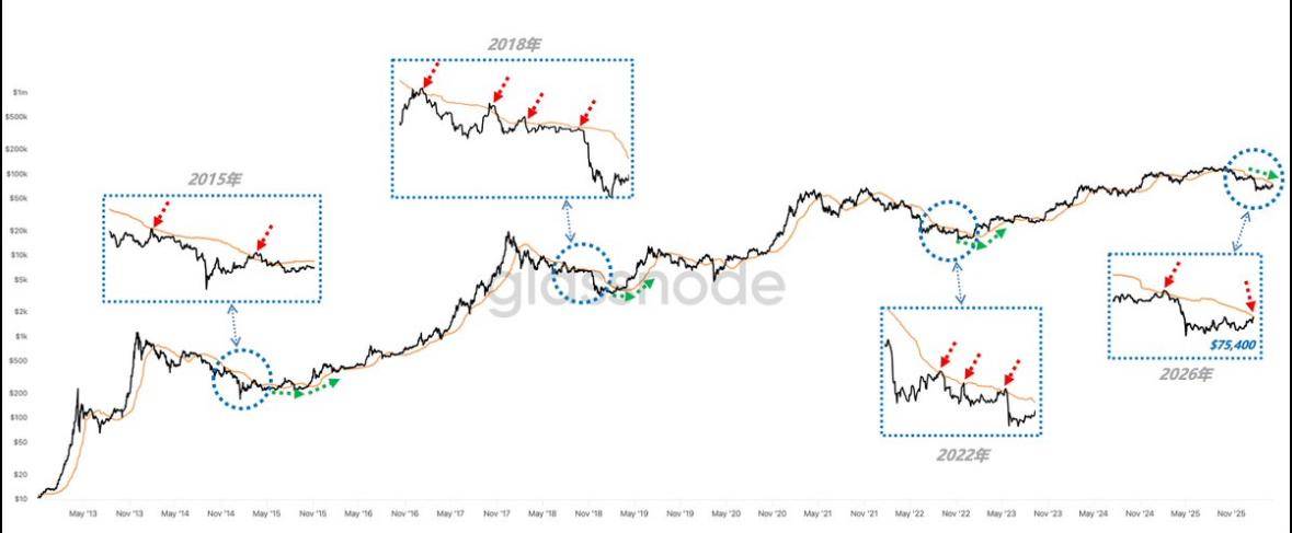 回顾 2015 年、2018 年和 2022 年的历史长轴,BTC 在熊市筑底期每次反弹至“黄线m_RP)时,几乎都会遭遇剧烈回调。