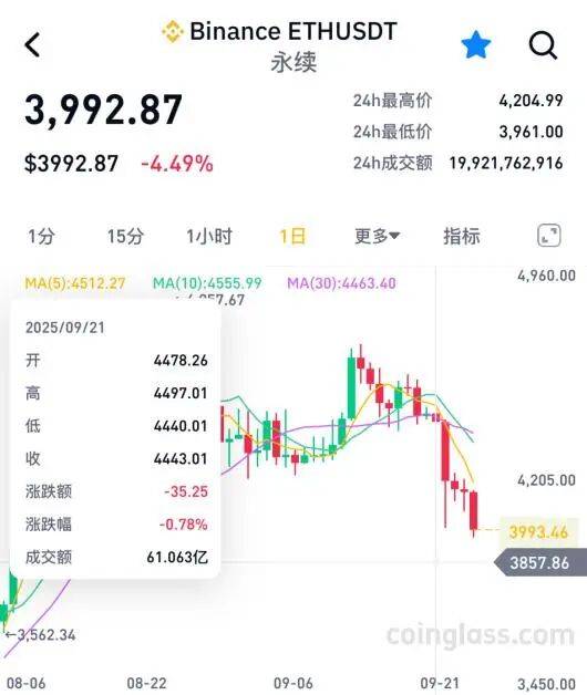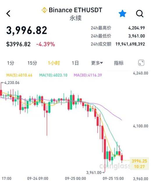 9月25日,据CoinGlass行情数据,以太坊价格持续走低,一度下探至4000美元附近。