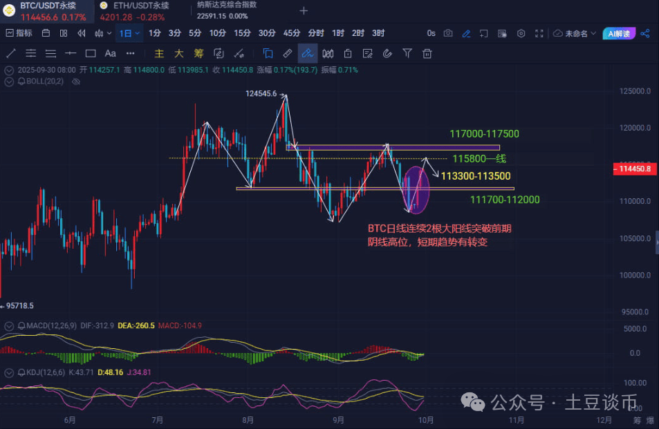 比特币日线图显示,已经连收三阳,突破前期大阴线,短期趋势有所转强,但尚未完全确立,已形成W形态走势。压力位在11多次受阻回落,短期需关注11压力区。若日内突破,后续有望挑战117500上方。