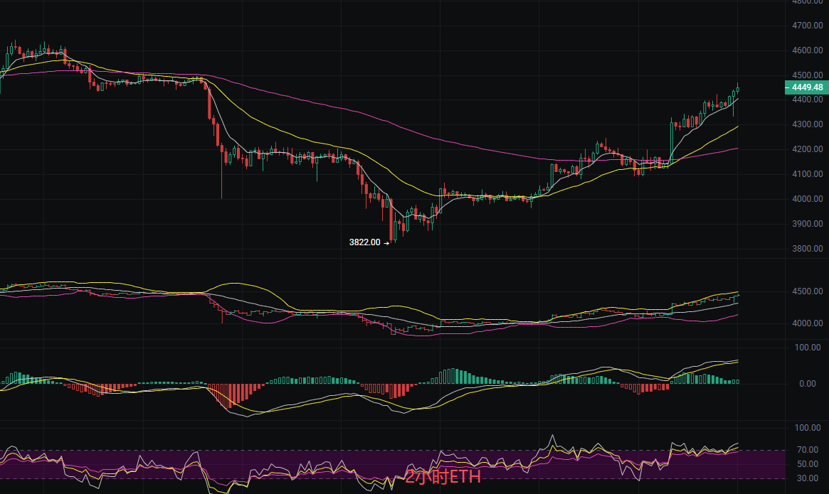 发稿前以太坊现价4450,丽盈观察目前盘口以太坊技术面和外部环境分歧导致趋势不明。K线形态出现了典型的看跌反转信号(三只乌鸦),且成交量极度缩量并伴随量价背离,削弱了上涨趋势的可靠性。此外,价格当前位于4421支撑位和4643阻力位之间,支撑位的有效性成为短期市场方向的关键,日线附近出现明显上影线,表明短期存在一定抛压,MACD2小时多头趋势明显,EMA呈现多头排列,支撑力度较强,丽盈连续多日坚持的多头依旧有效,跟随趋势多为主,谨慎开空