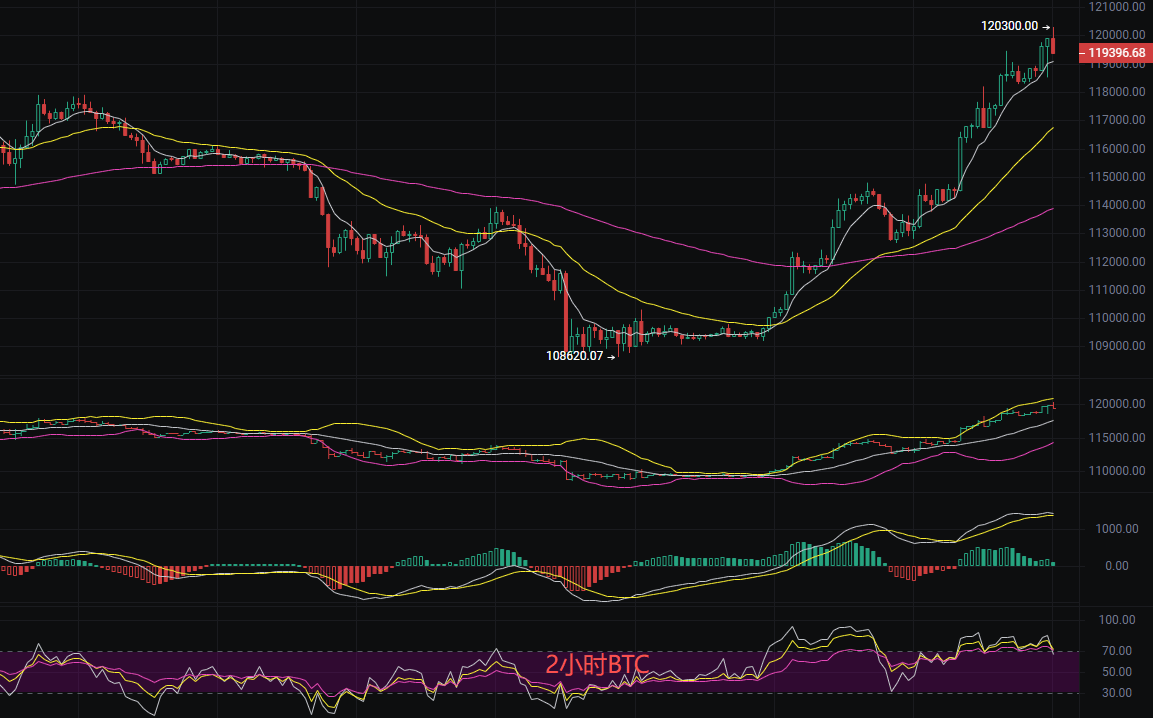 比特币现价119400,丽盈判断大饼区间震荡格局,技术面和外部环境均未提供明确的单一方向驱动。均线系统黄金交叉强化看涨动能。价格已接近强阻力位120300,进一步增加了向上突破的难度,日线连续上涨强势突破走势,2小时K线附近未能有效突破,短期可能面临回调压力,MACD日线小时动能减弱迹象初显,EMA整体趋势依然向上,丽盈建议12上方开空有效可以持有